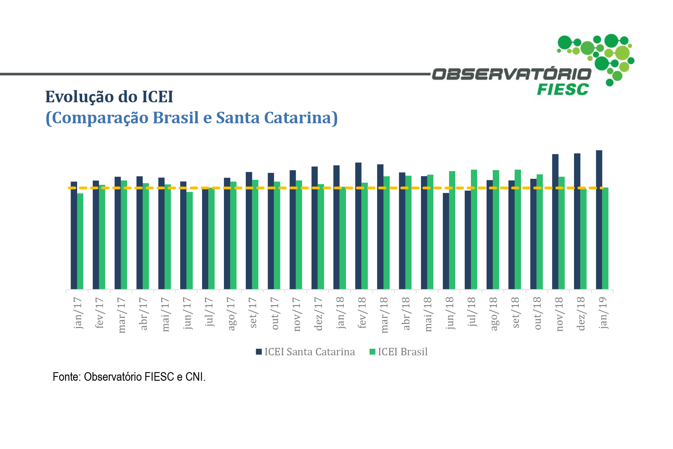 No Brasil, o aumento é o quarto consecutivo e o ICEI acumula crescimento de 11,9 pontos nos últimos quatro meses. Este patamar está 5,7 pontos acima do registrado em janeiro de 2018 e 10,4 pontos acima de sua média histórica. De acordo com a CNI, é o terceiro mês seguido que o indicador se mantém acima dos 60 pontos.