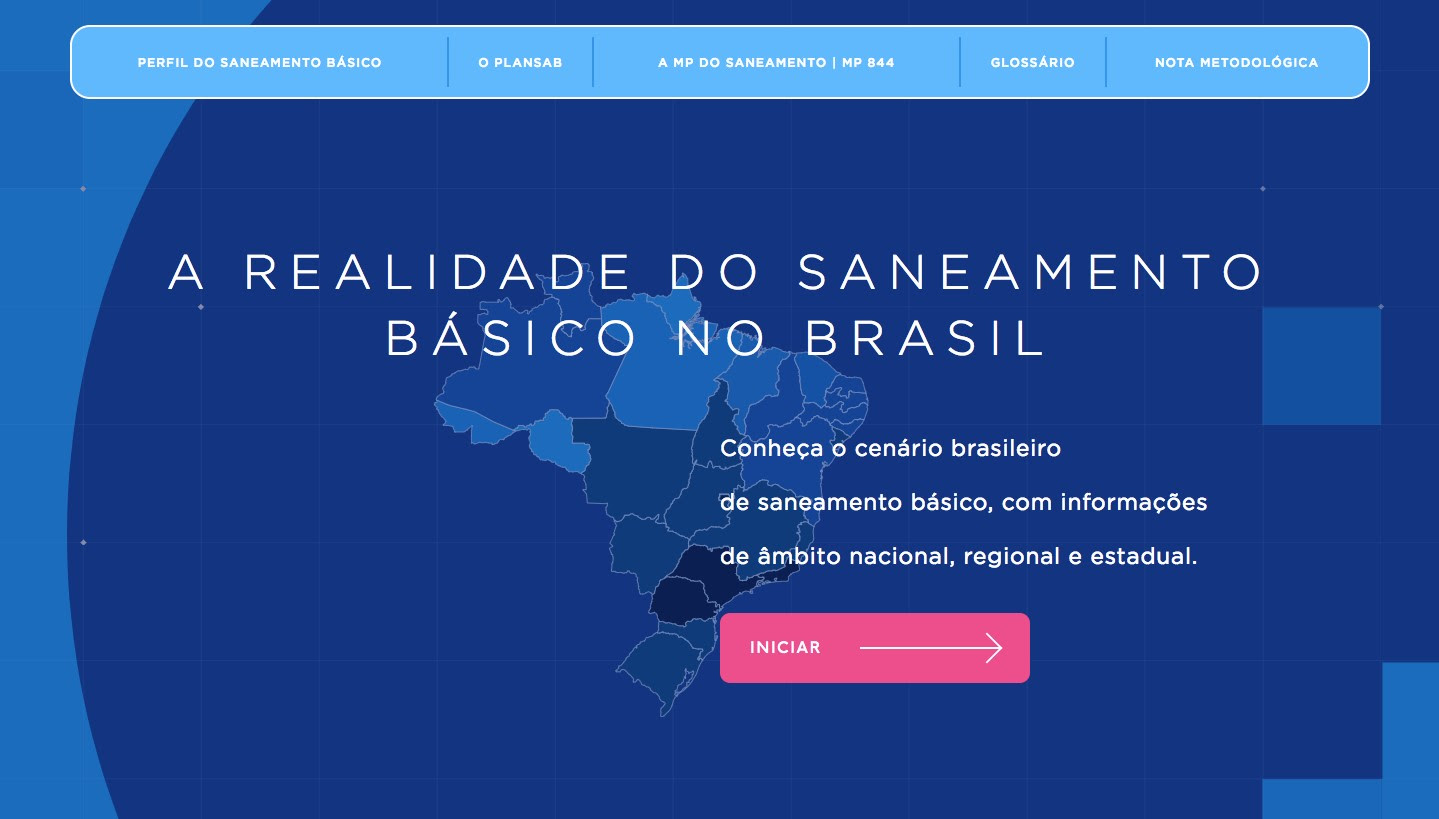 Para apresentar o cenário atual do setor, a Confederação Nacional da Indústria (CNI) apresenta o infográfico A realidade do saneamento básico no Brasil. A plataforma interativa reúne dados de diversas fontes oficiais num único ambiente. Por ele, o internauta pode interagir com o mapa brasileiro, que muda de cor conforme se seleciona um dos quatro indicadores para o saneamento básico: índices de abastecimento de água, de coleta de esgoto, de tratamento do esgoto coletado e incidência de doenças relacionadas à deficiência no atendimento à população.