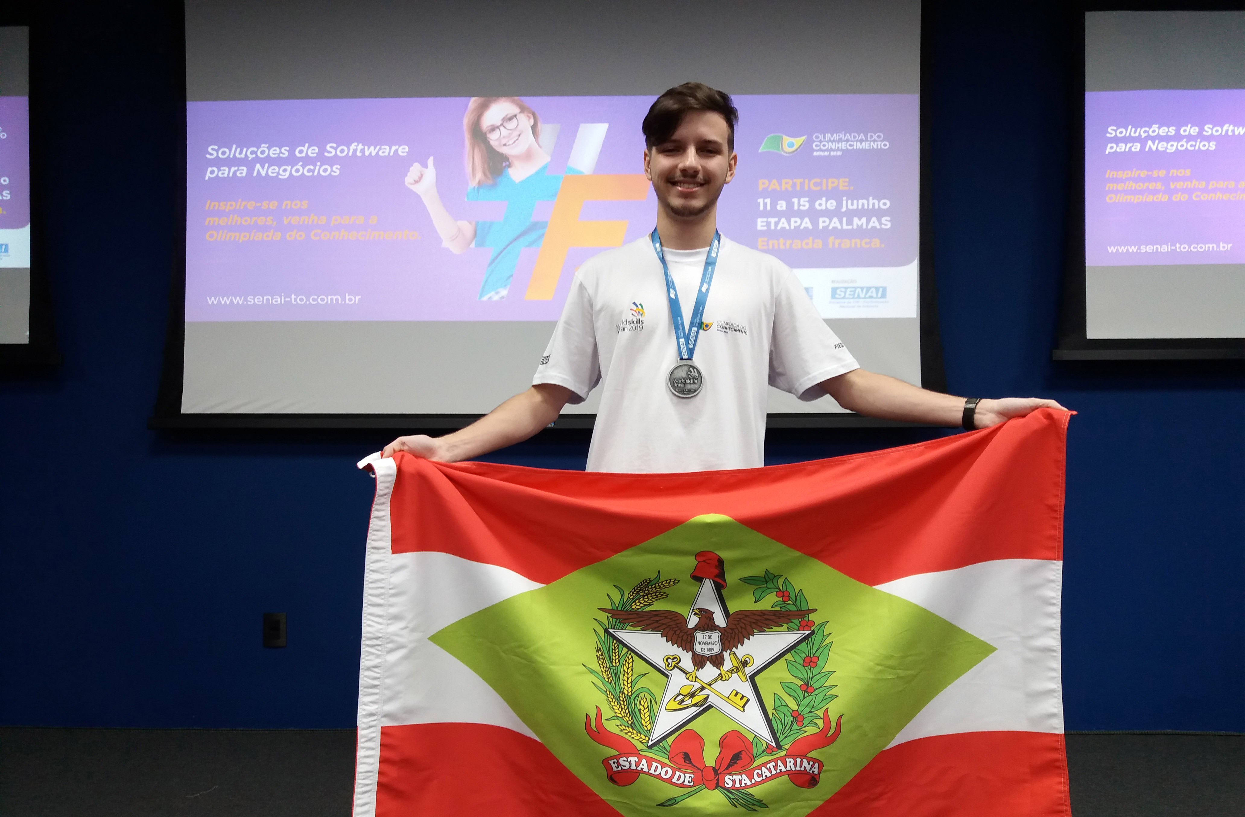 Florianópolis, 15.6.2018 – O estudante Gabriel Ribeiro, do SENAI em Blumenau, conquistou medalha de prata na ocupação soluções de software para negócios, nas seletivas para a WorldSkills Competition 2019. As provas ocorreram em Palmas (TO) durante esta semana. O bom resultado alcançado habilitou Gabriel a disputar uma vaga na delegação brasileira em provas de desempate que serão realizadas em novembro.