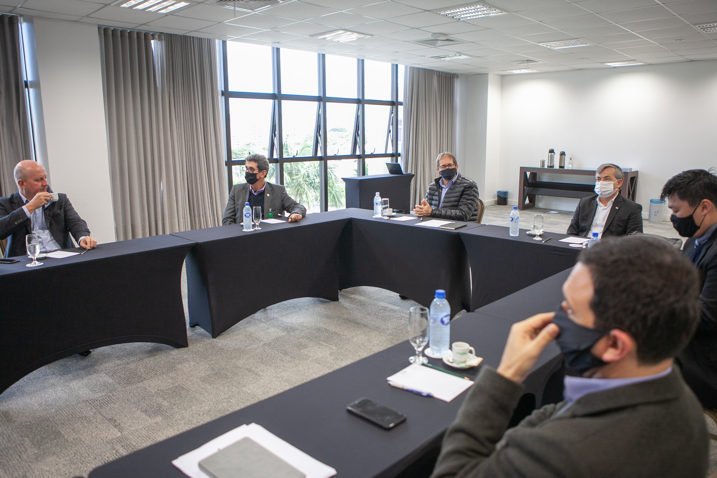 Florianópolis, 9.7.2020 – Os secretários da Fazenda, Paulo Eli, e do Desenvolvimento Econômico, Rogério Siqueira, participaram de reunião com o presidente da Federação das Indústrias de Santa Catarina (FIESC), Mario Cezar de Aguiar, e a diretoria executiva da entidade, nesta quinta-feira (9). Em pauta estiveram uma série de questões tributárias, política fiscal para estimular a economia e os próximos passos do Programa Travessia, proposta da FIESC para reinvenção econômica do estado após a pandemia, que tem apoio do Conselho das Federações Empresariais de Santa Catarina (COFEM). O secretário adjunto da SDE, Ricardo Stodieck, também esteve presente.