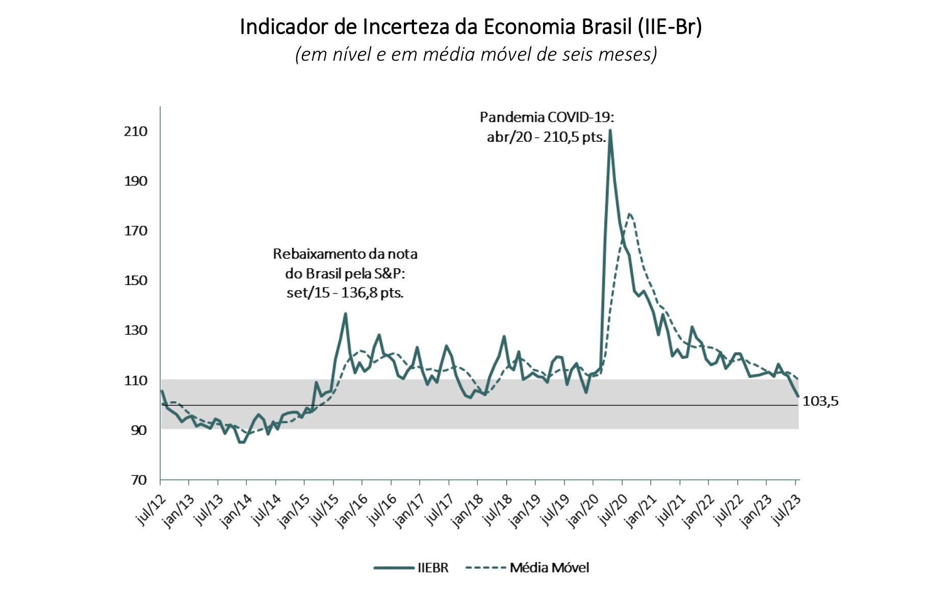 Florianópolis, 3.8.2023 - O Indicador de Incerteza da Economia (IIE-Br), da Fundação Getulio Vargas, caiu 4,1 pontos em julho, para 103,5 pontos, menor nível desde novembro de 2017. O índice acumula agora uma redução de 13,2 pontos nos últimos quatro meses.