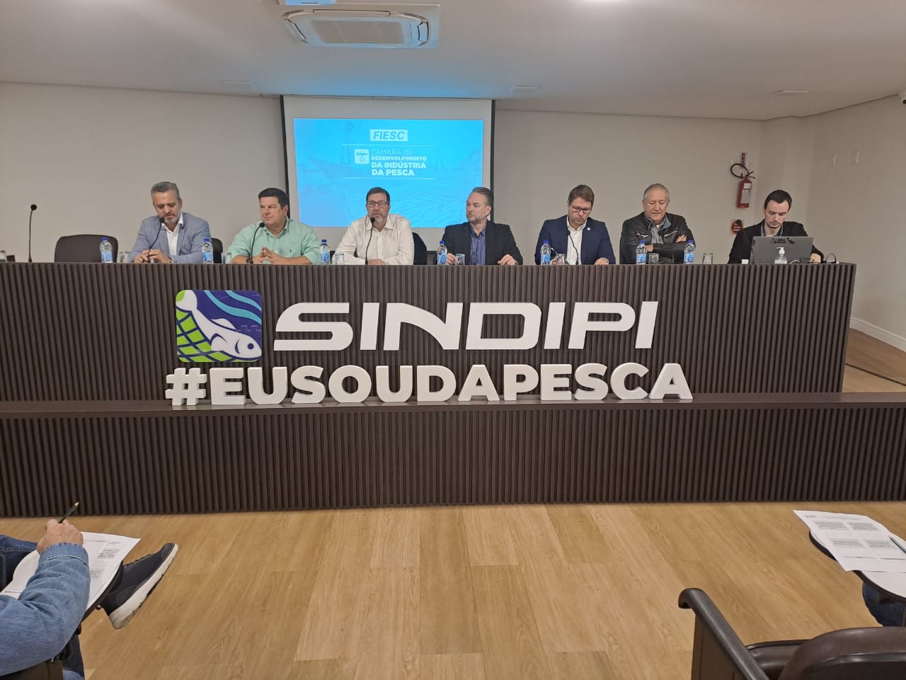 A reunião contou ainda com as presenças de Agnaldo dos Santos; presidente do Sindipi; Delcy Norberto Batista, superintendente federal de Pesca e Aquicultura no Estado de Santa Catarina; Maurício Cesar Pereira, vice-presidente regional da FIESC; e Rodrigo Silveira, diretor de pesca de Itajaí, além de armadores e empresários do setor.