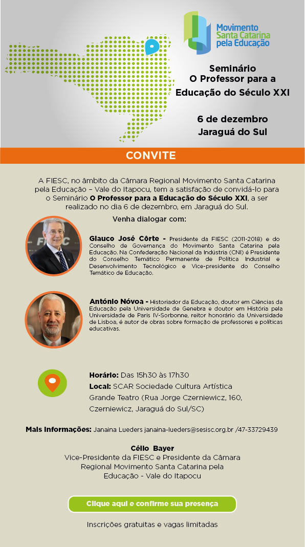 Florianópolis, 29.11.2017 – A Câmara Regional do Movimento SC pela Educação - Vale do Itapocu promove no próximo dia 6 o seminário O professor para a Educação do Século XXI. Mil educadores são esperados no evento que será realizado na Sociedade Cultura Artística (SCAR), a partir das 15h30. As vagas são limitadas e as inscrições gratuitas podem ser feitas clicando aqui. As discussões sobre o tema serão conduzidas pelo presidente da FIESC, Glauco José Côrte, e pelo reitor da Universidade de Lisboa, Antônio Nóvoa.