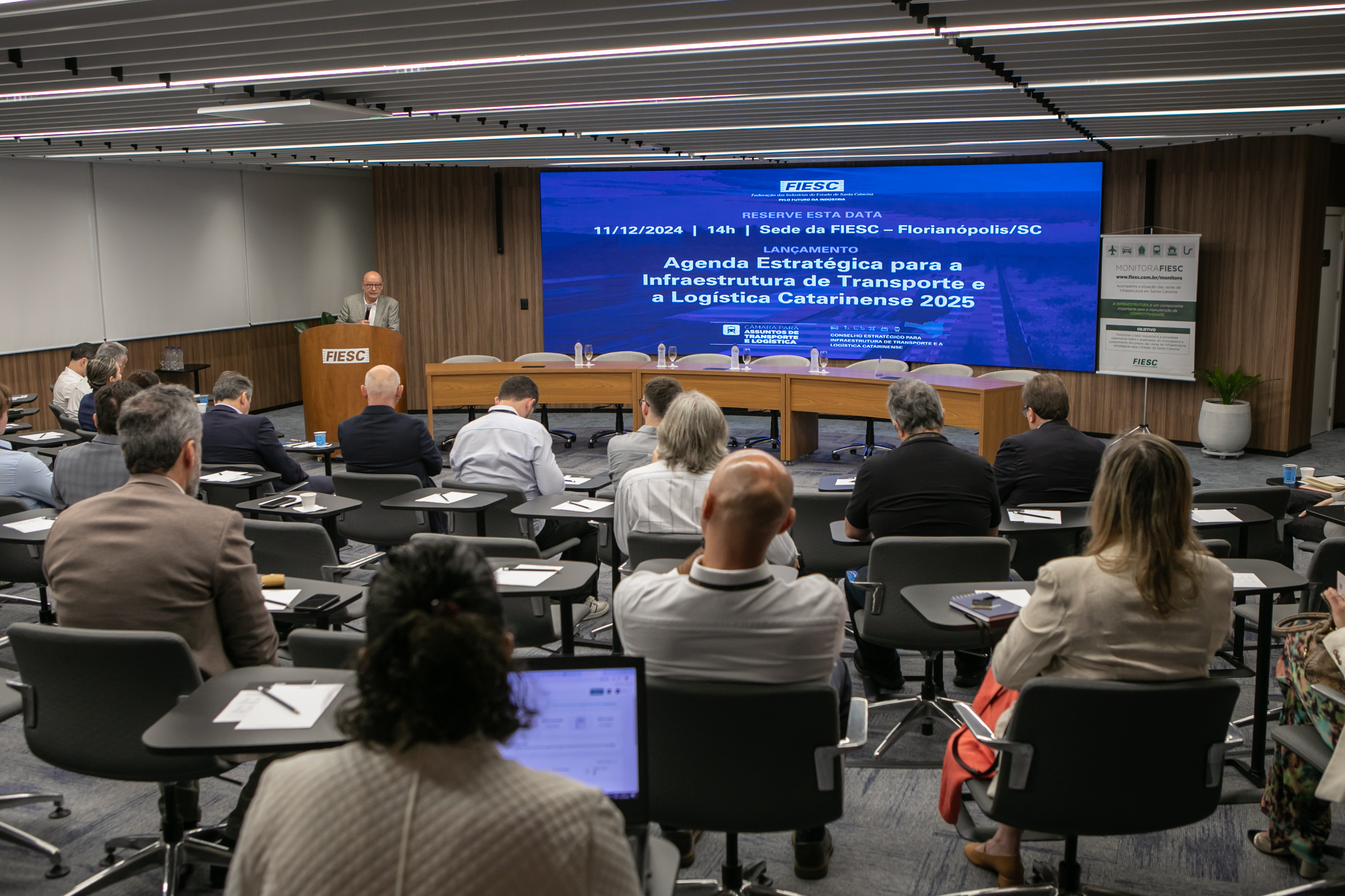 Florianópolis, 20.11.24 - A Federação das Indústrias de SC (FIESC), por meio da Câmara de Transporte e Logística, realizou nesta terça-feira, dia 19, uma reunião para buscar soluções para a situação crítica do transporte marítimo e dos terminais portuários catarinenses.